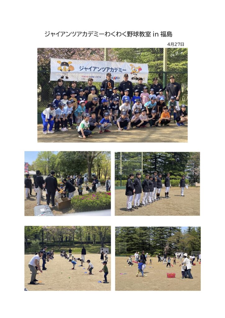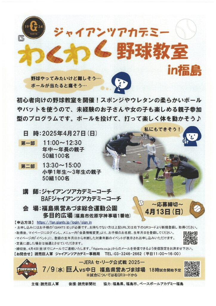 ジャイアンツアカデミーわくわく野球教室 in 福島 2025.04.27 大会・イベント 女子野球GIANTS杯福島大会の開催と、7月9日のジャイアンツ公式戦の開催にあわせて、ジャイアンツアカデミーわくわく野球教室が開催されました。 お知らせ大会・イベント観光・その他